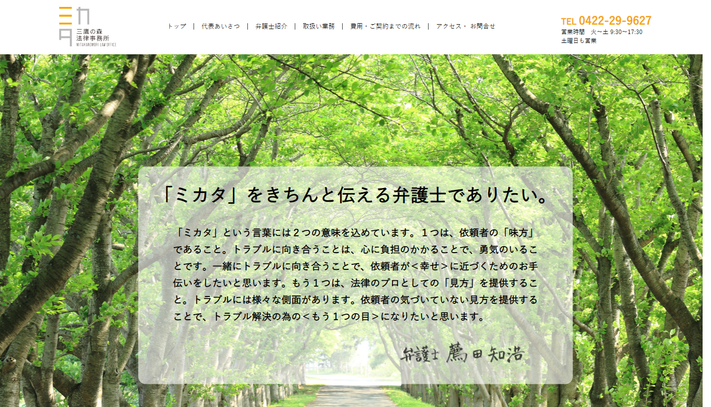 引用:https://mitaka-law.jp/ Googleで「三鷹 弁護士」で検索して1位に表示されたサイトです。安心感を感じる良い雰囲気のサイトだと思います。ただ、1位に表示されているのは、SEO対策の結果ではなく、偶然的なものだと感じます。当…<続きをみる>