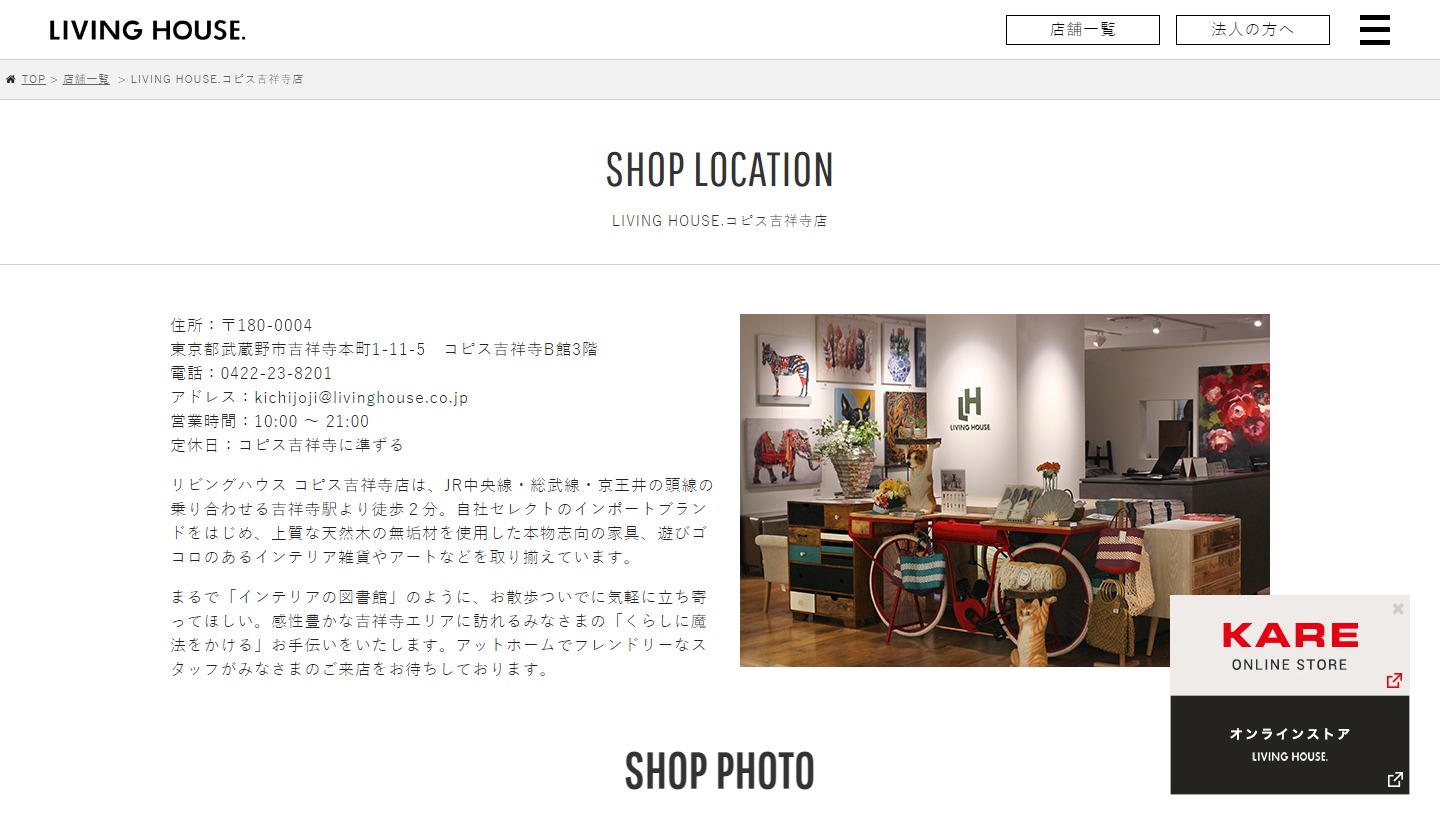 引用:https://www.livinghouse.co.jp/branch/kichijoji/ 武蔵野市の吉祥寺にはインテリアショップがたくさんありますが、検索結果上位にお店はこないですね。1位はMapFanでした。