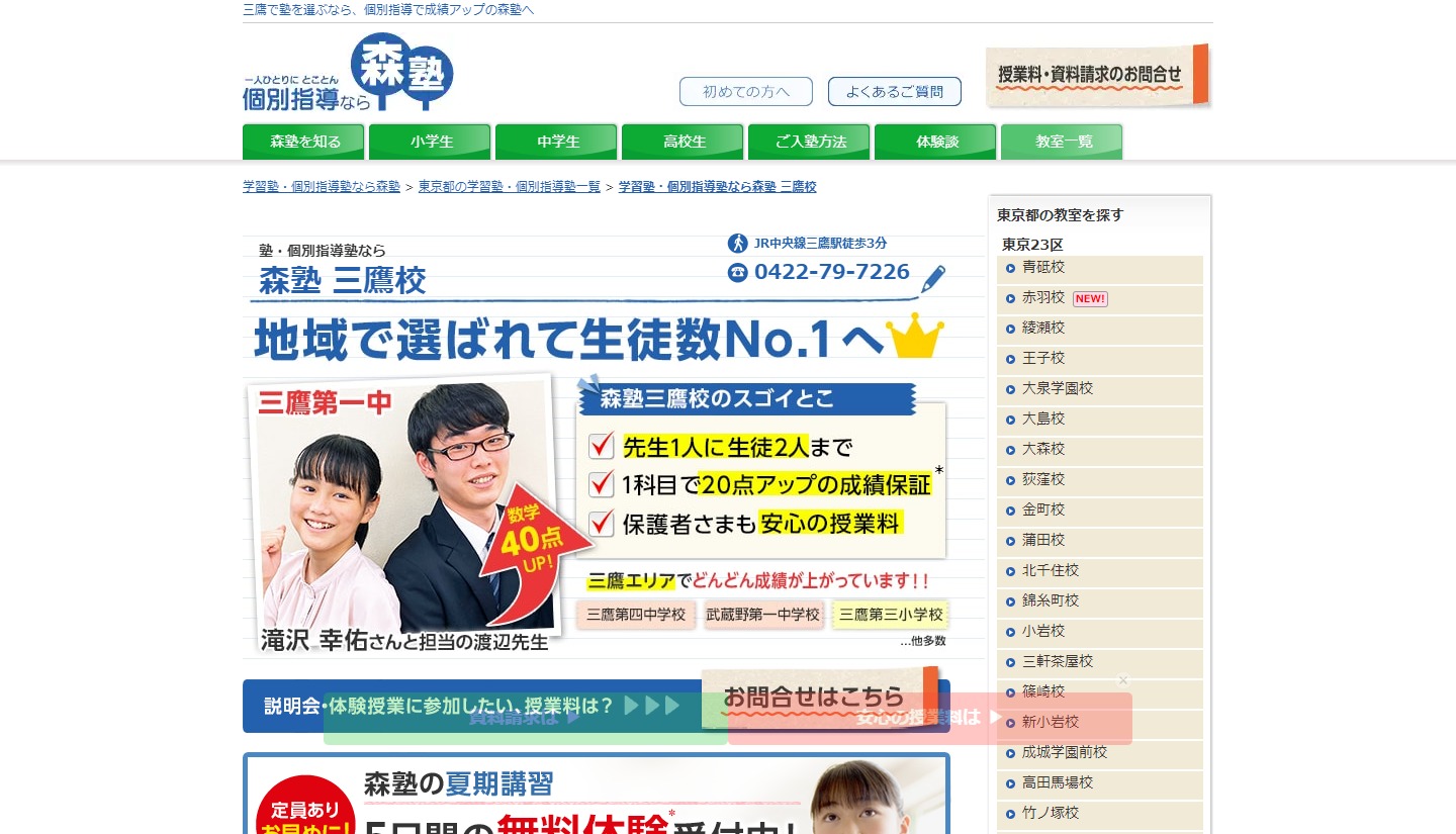 引用:https://www.morijuku.com/school/mitaka/top.html 校舎がいくつもある大手ですね。トップページではないページをこのような検索キーワードで2位に表示させているのは、よくできていると思います。その校舎の校長のコメントがしっかりと書かれていて、他の校舎のペー…<続きをみる>