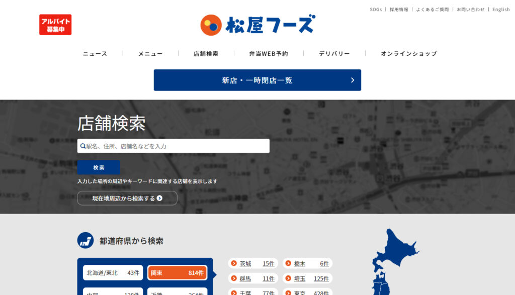 松屋フーズの本社は武蔵野市の三鷹駅北口すぐにありますね。このように店舗の場所をマップで示したり、検索できるようにすることももちろん可能です。